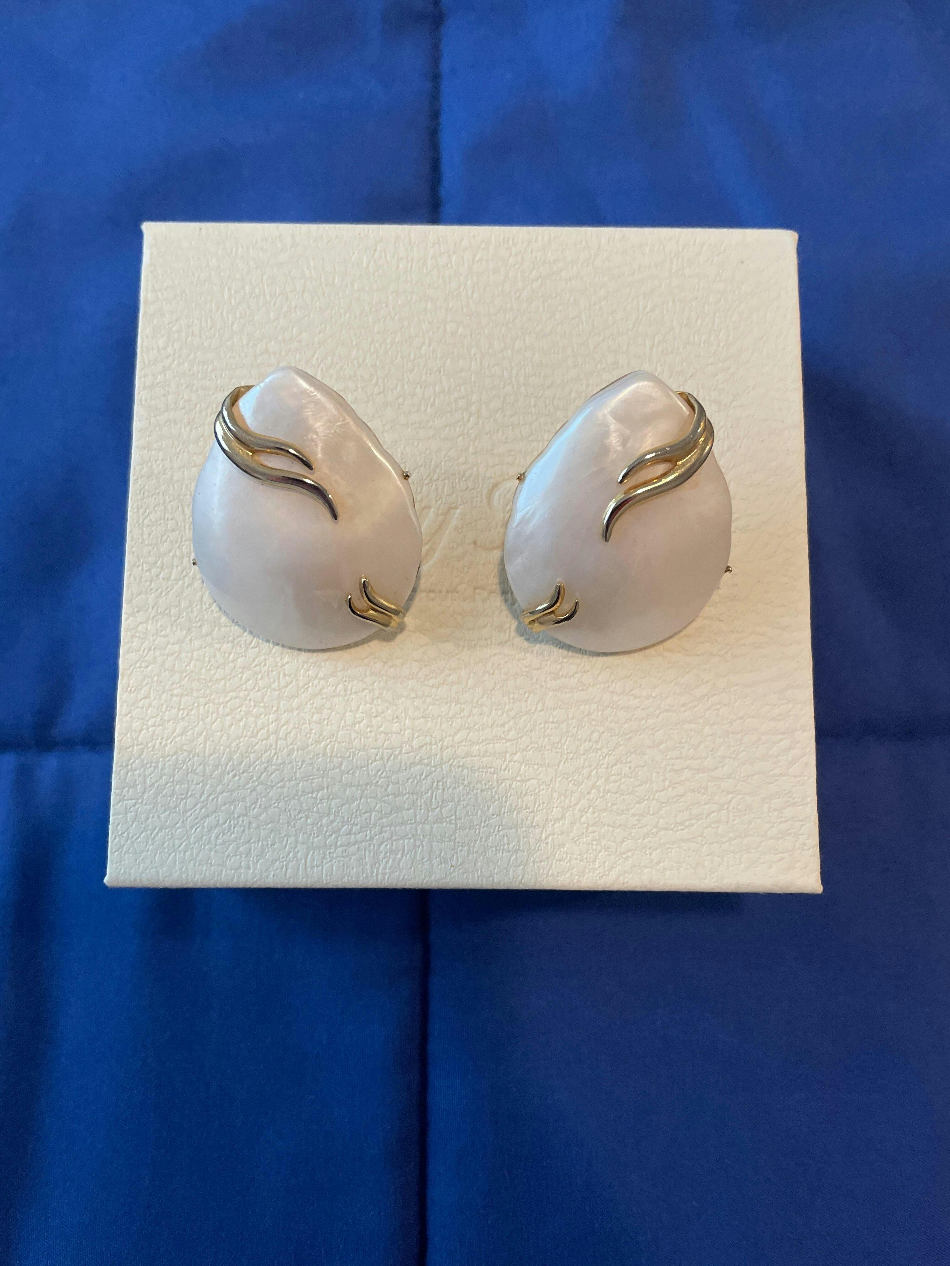 Harvested from another dimension and reconstructed in this one. These otherworldly vintage earrings are made of faux mother-of-pearl likely a hardened acrylic shell, encased in surreal molten gold-toned accents. Originally clip-ons, they’ve been reborn with stainless steel posts. They show faint signs of wear from their past life, with subtle fading on the gold plating, but still glow like freshly-pumped celestial nectar.