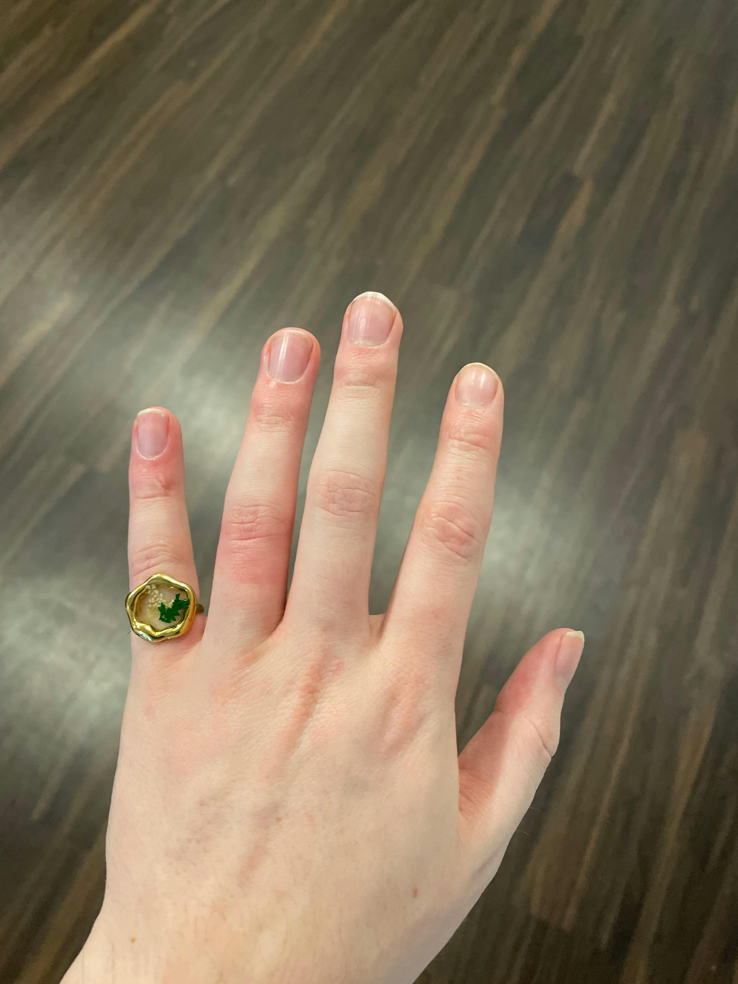 Pressed like a dried petal between journal pages. The Garden-Soft Ring features real florals sealed in resin, captured inside a fluid gold-plated band, like the memory of a summer you never fully healed from. With hints of grassy green and delicate ivory petals, she’s a quiet over-thinker who romanticizes watering her plants but forgets to hydrate herself.
