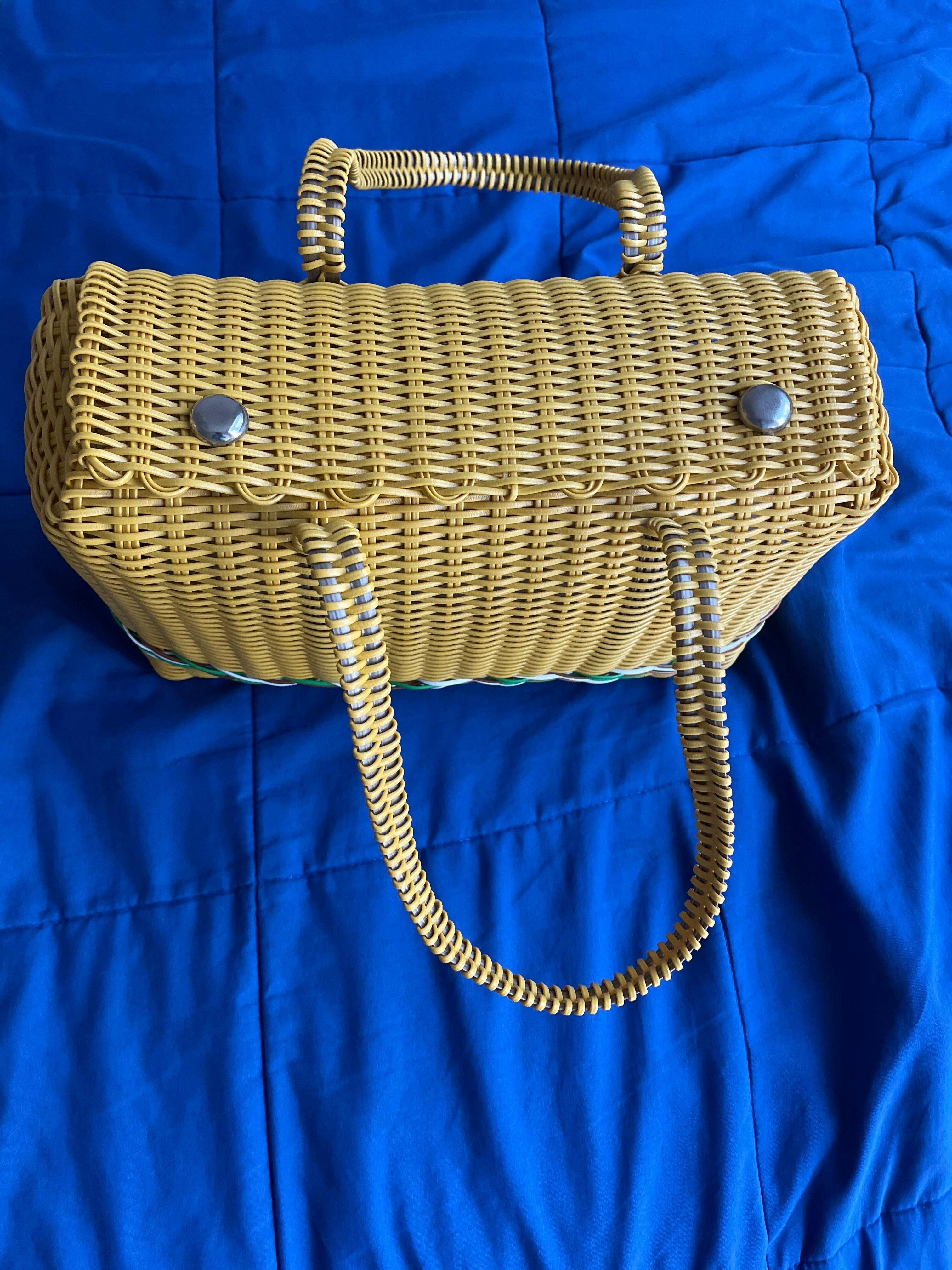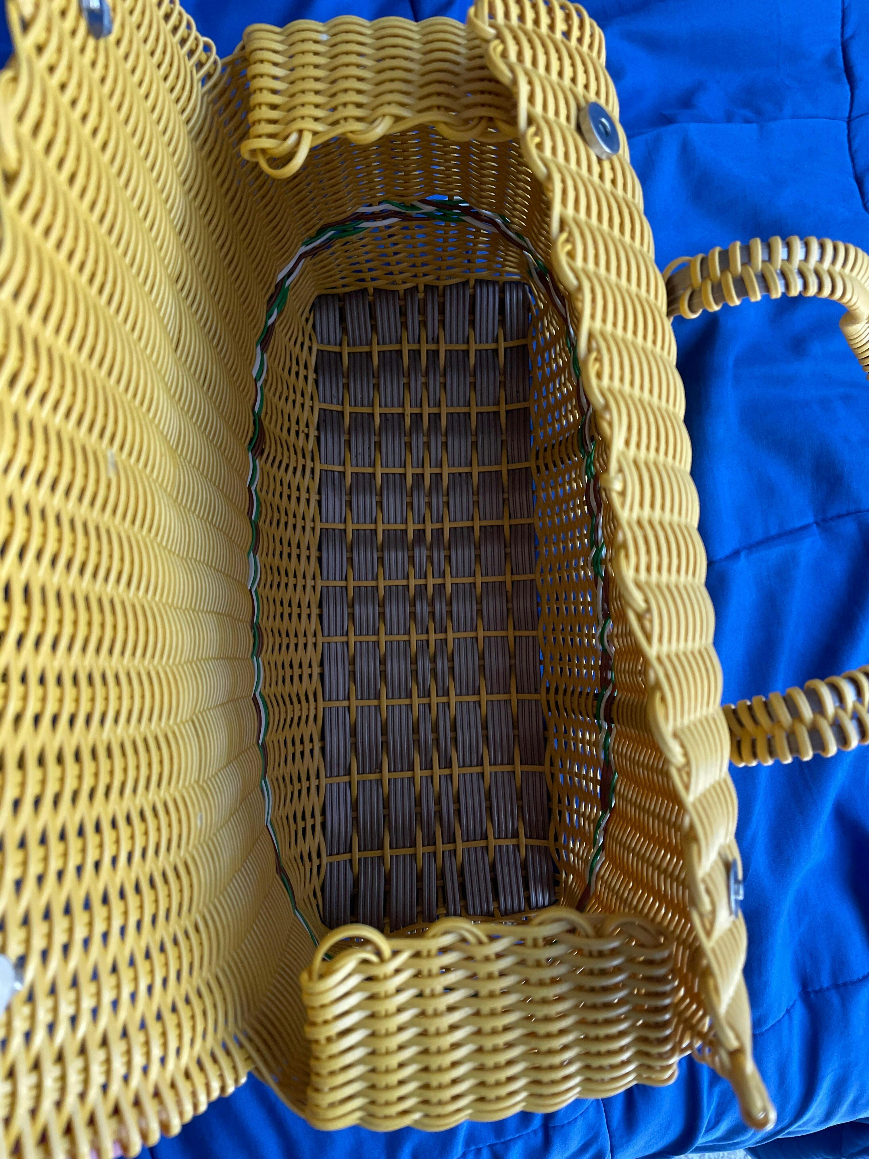 Color: Golden yellow body with a brown, green, and white woven stripe along the bottom edge