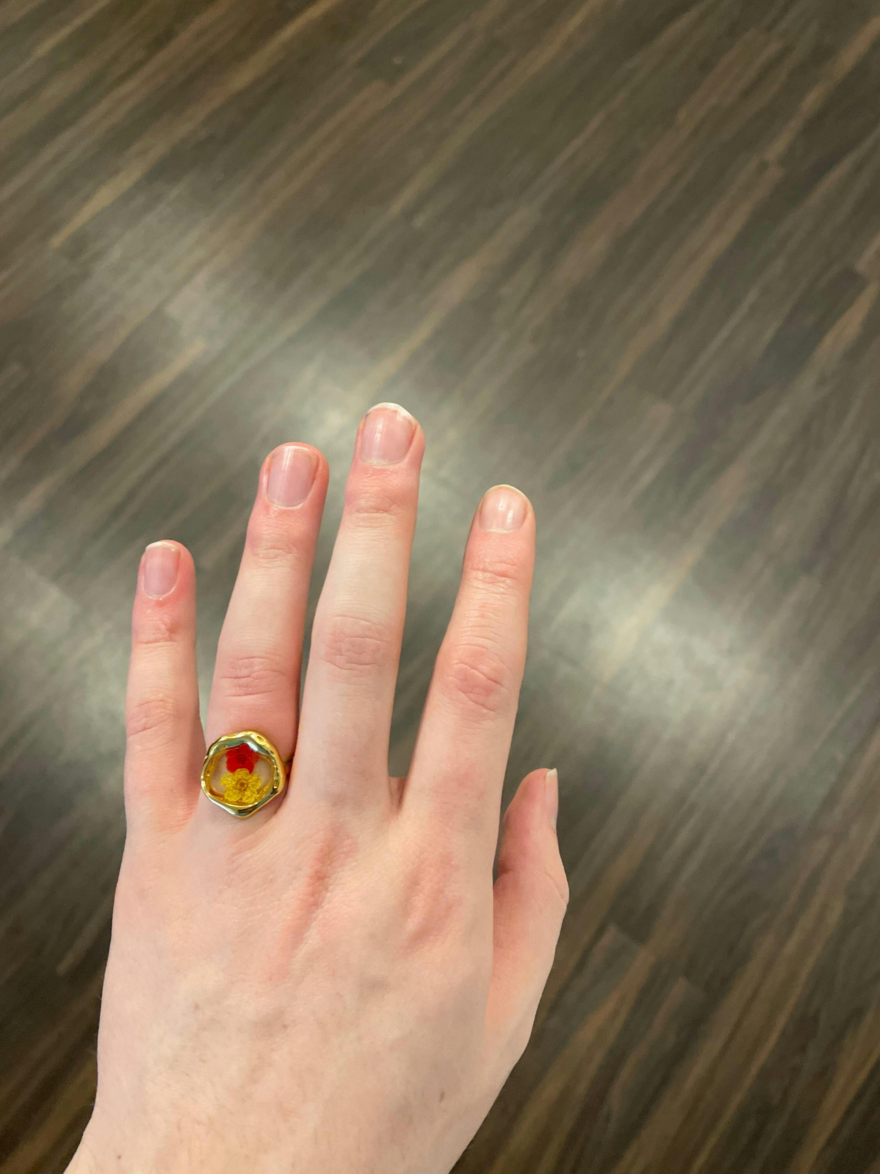 Your soft life era, but wearable. Real dried flowers, hand-poured resin, 18k gold-plated stainless steel ring. Each one is unique, just like your moods or your playlist. Perfect for the girlies who journal at brunch, flirt in farmers markets, and ghost their ex before noon.